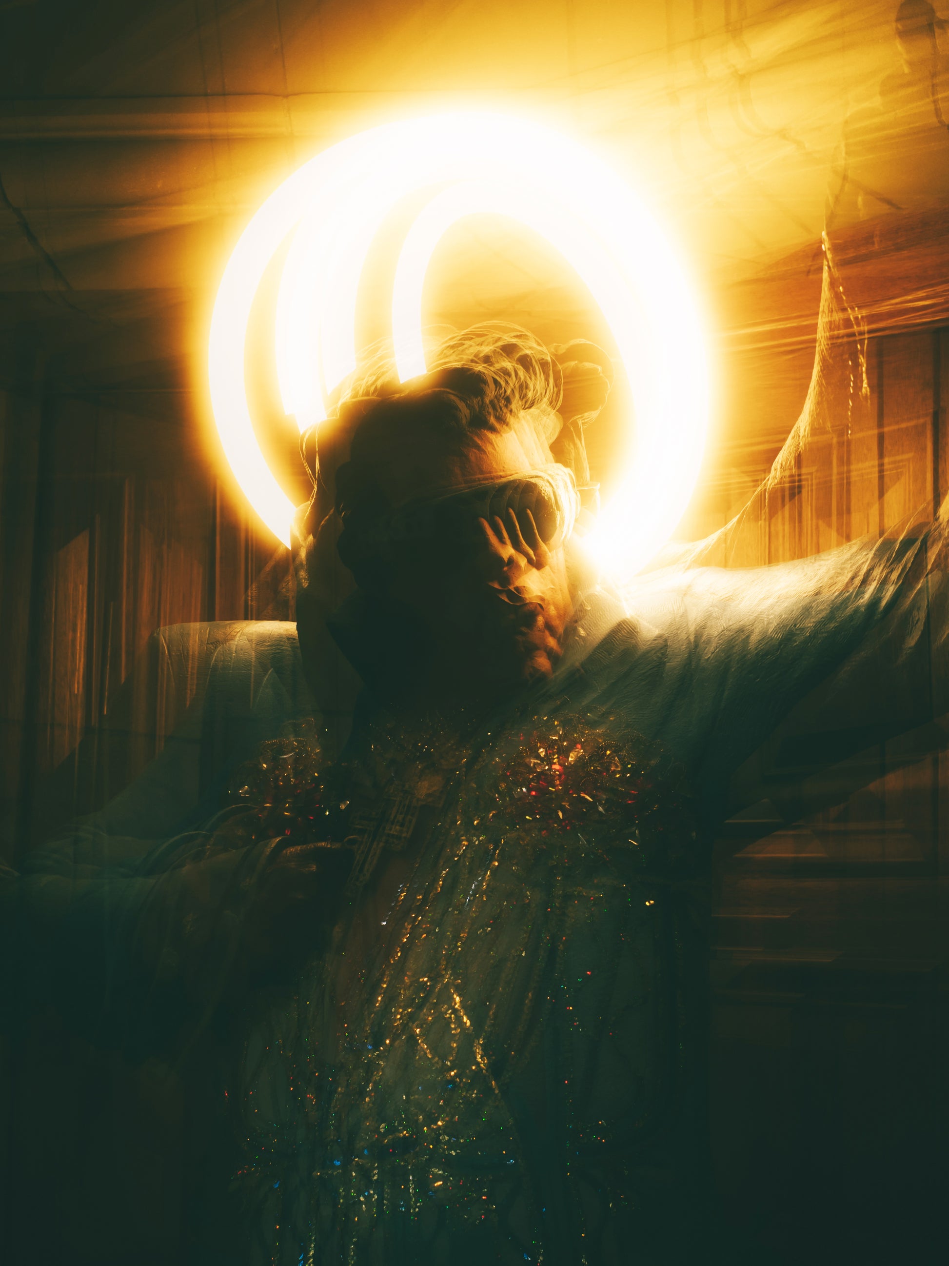 This striking image captures a statue of Elvis at the Kelvingrove Art Galleries through multiple exposures — seven shots combined to create this singular view. The golden light and shadows subtly highlight the contours of his face, while the unusual angle gives the statue a uniquely dynamic presence. I love how the composition brings out both the majesty and the quirks of this iconic figure, making it a piece that draws you in and invites closer inspection.