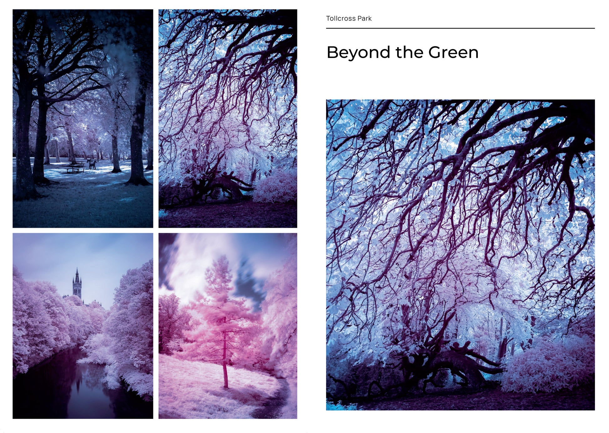 The fourth and final volume of the series focuses on parks that hold deeply personal memories. Experimental infrared photography transforms familiar landscapes into dreamlike realms, with glowing reds and soft pinks replacing the everyday greens.